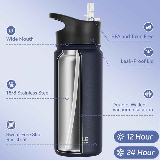 Insulated Water Bottle Kids 16 Oz Double Wall Vacuum Stainless Steel Water Bottle Leak Proof for School Wide Mouth with Straw Lid & Spout Lid Keeps Cold and Hot(Navy,1Pack)