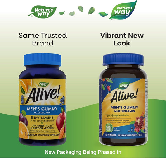 Alive! Men'S Daily Gummy Multivitamin, Supports Energy Metabolism*, Muscle Function*, B-Vitamins, B-Vitamins, Gluten-Free, Vegetarian, Fruit Flavored, 60 Gummies (Packaging May Vary)