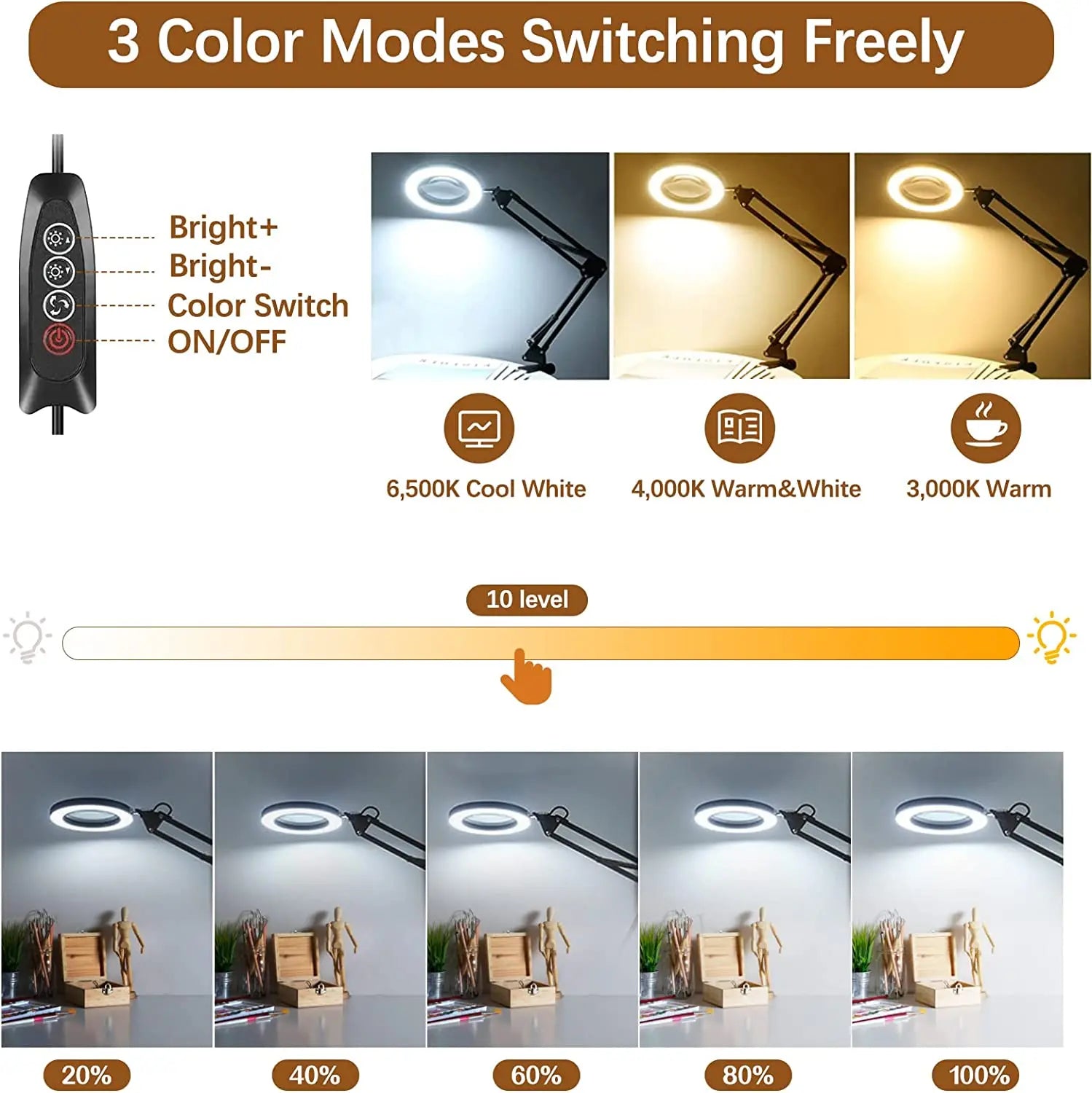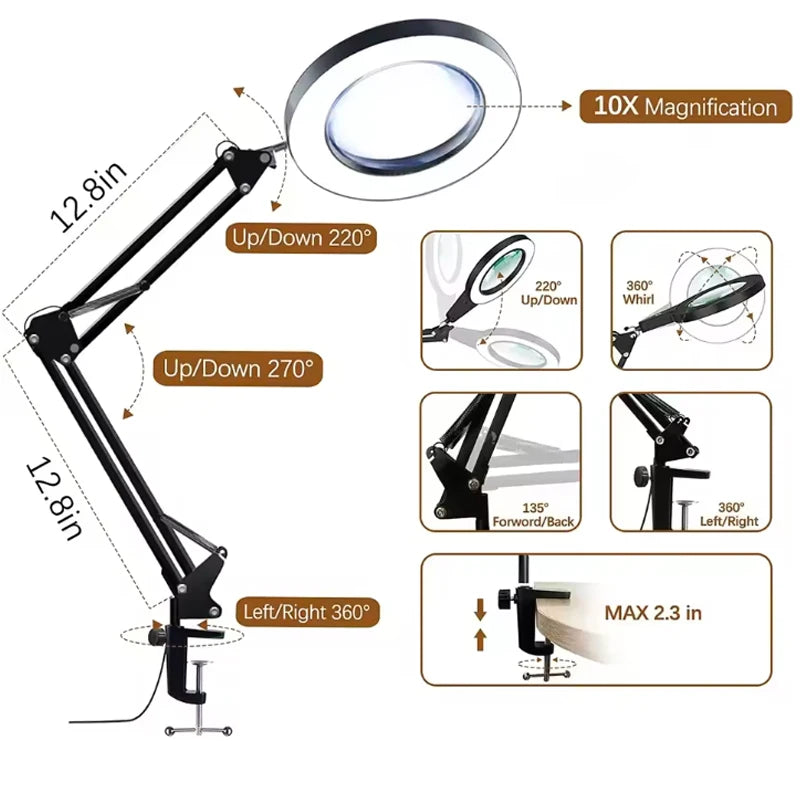 【10x Magnification】High definition optical lens,upgrade to 1000% magnification, more effective and real auxiliary reading, manual production, view instructions,etc.In order to provide professional help to long-time close workers and people with poor eyesight, the lens will not cause dizziness. 【Color Light&Brightness】Cold white light/Warm Light/White and Warm Mix-3 colors can be freely switched, 10 levels of brightness can be adjusted by buttons(10% - 100%). Choose the most suitable light source according to the environment and needs, provide perfect amplification effect for lovers of manual manufacturing, puzzle, painting, embroidery, manicure,etc. ️【Smooth Angle Adjustment】360 degrees rotatable, creating any angle for you to use. Two elongated aluminum rotating lamp arms are connected, and the lens can be adjusted freely to move the appropriate working position you want, provide the best light while freeing your hands. 【Simple Installation Design】Without any tools, first install the bottom clamp on any table, workbench or shelf, with a thickness of no more than 2.3in. Rotate and tighten the long screw to fix it, then insert the aluminum arm of the magnifying glass, and finally install the magnifying glass lens. ‍【Care About Eye Health】This is an ideal gift for yourself, friends or the elderly. Soft and uniform light is beneficial to our eye health. Large area enlargement can help people with vision problems or meticulous work. Our team provides 24-hour after-sales assistance. Please contact us if you have any questions.