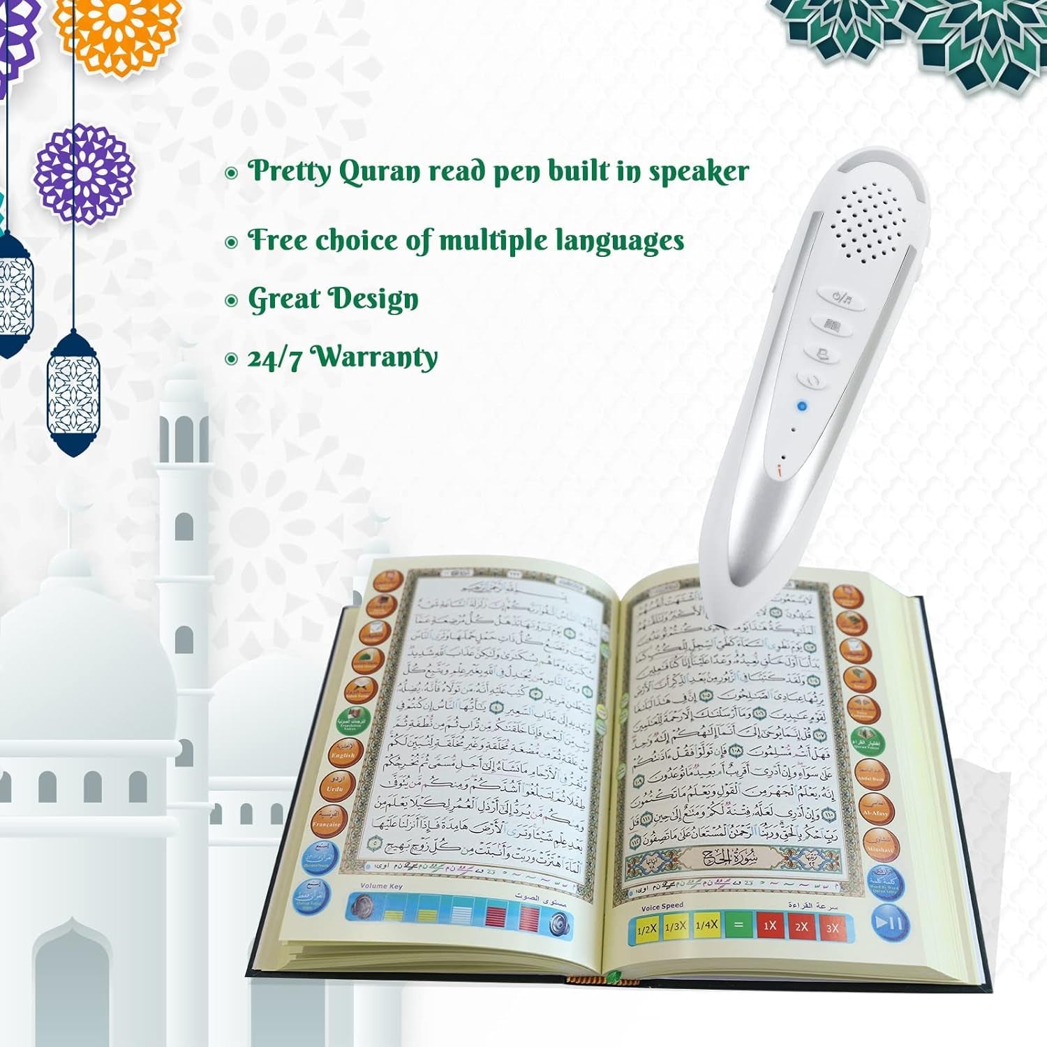 • MULTIFUNCTION: Read / Record / Repeat and Translate, complete voice recitations of the Holy Quran by Al-Afasy, Ajmi, Abdul Basit, Al-Meaqli and Aya, switch freely between reciters and translations. Standard voices such as Arabic, English, Urdu, French in pen due to limited memory. If you need any other language, please contact us to get the download method