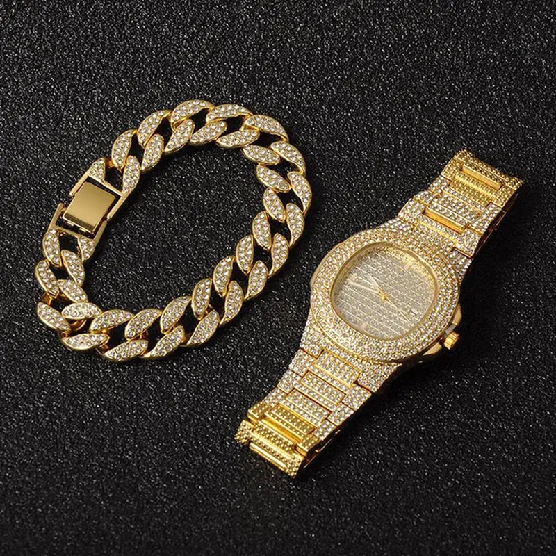 2 Pcs/set Luxury Full Iced Out Watch Mens Cuban Link Chain Bracelet Watch Bling Jewelry for Men Big Gold Chains Hip Hop Men Watch Set