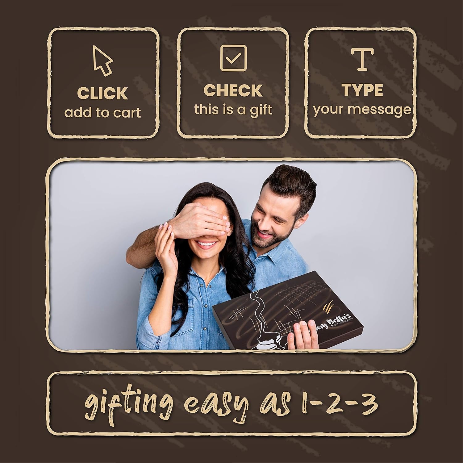 • Say more with a gift that speaks volumes: I’m Granny Bella, and I know all about young love, old friendship, and good treats! Find a dozen more ways to say “I love you” with my beautiful set of 25 chocolate-covered sandwich cookies. All in an exquisite, ready-to-gift box, dressed in a charming decorative coffee design.