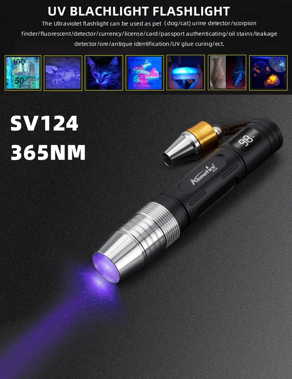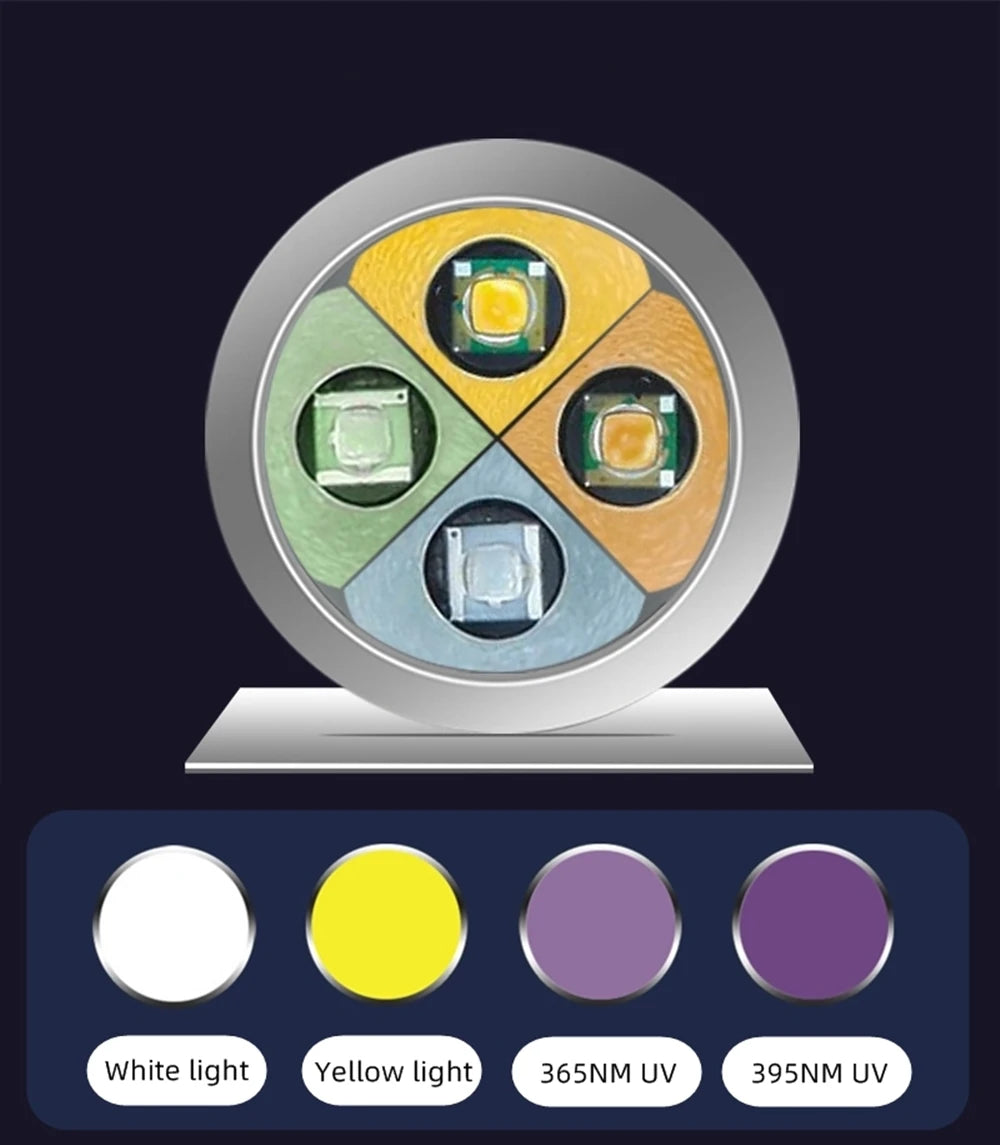 Work Mode:4MODES: White light - yellow lightt - 365NM UV light - 395nm UV light