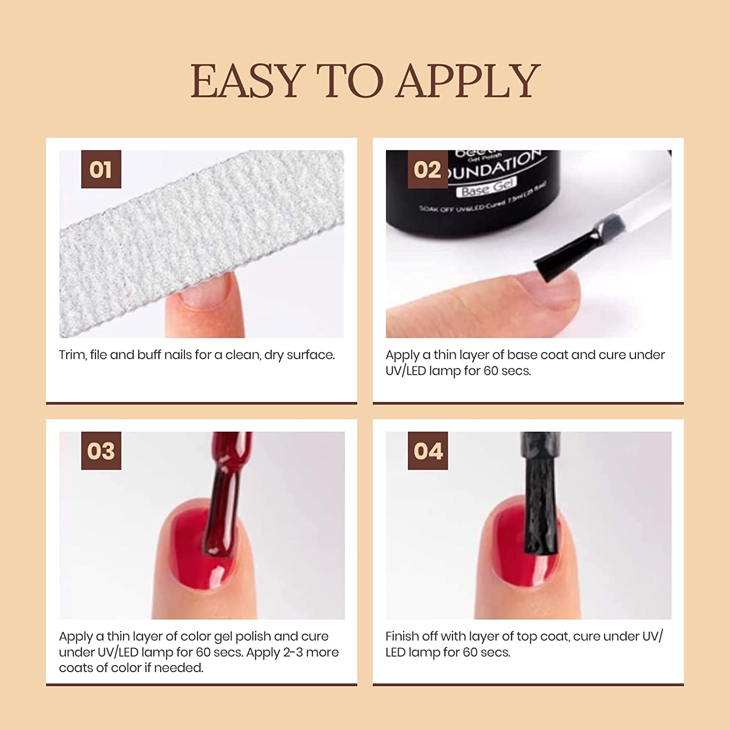 • Speed Curing with UV/LED Nail Lamp: The natural skin tone series gel polish set needs to be cured under LED/UV light. Base and Top coat required. Average for UV/LED light 60-120 secs.