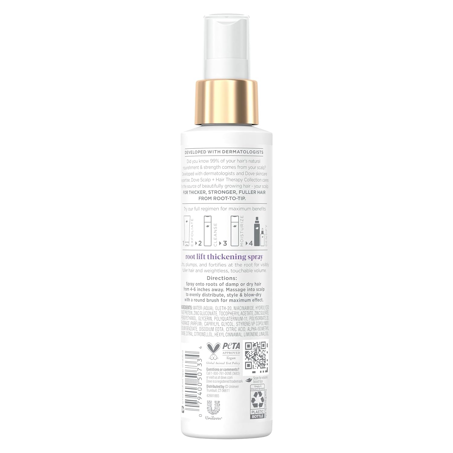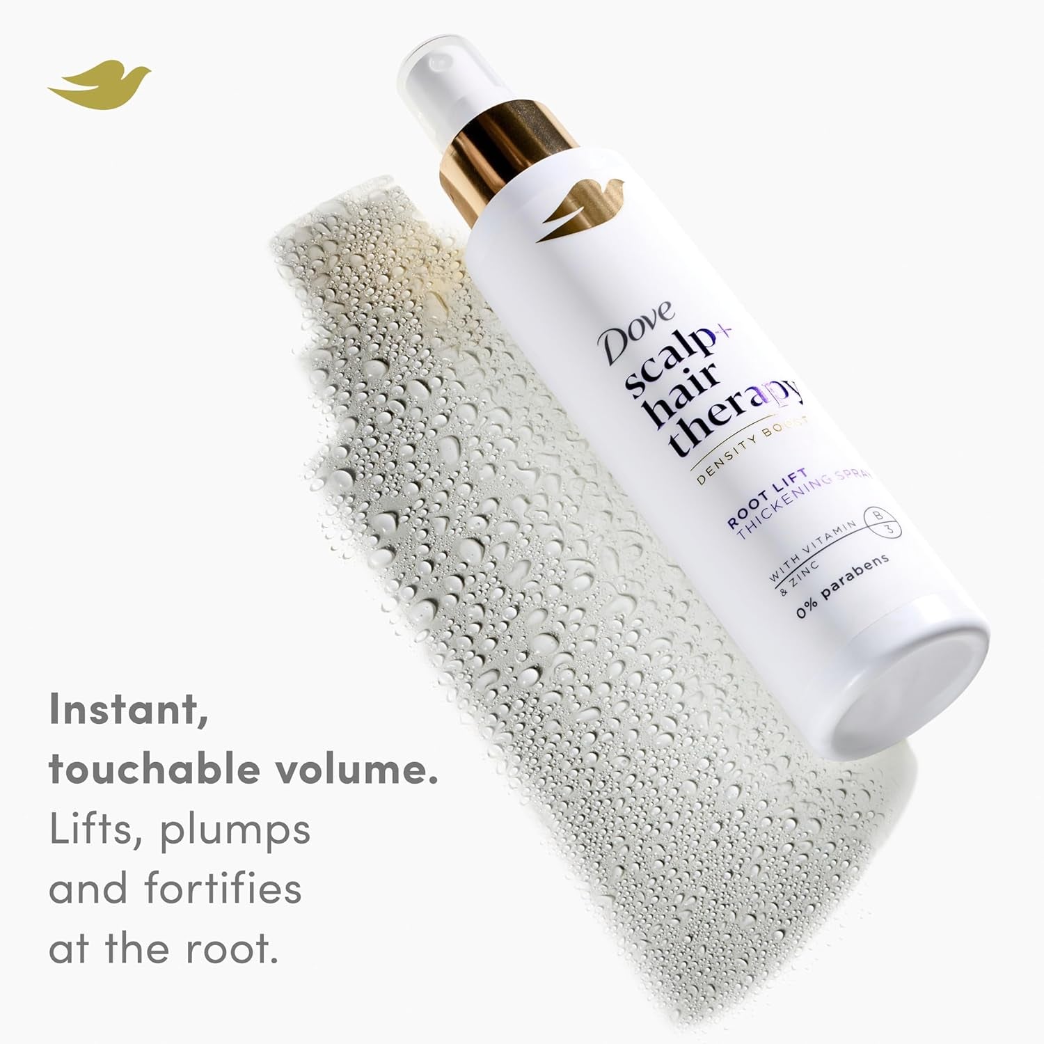 Embark on a hair-transforming journey with Dove Root Lift Thickening Spray for Scalp + Hair Therapy, featuring an innovative 0% sulfates formula enriched with scalp-nourishing ingredients like Vitamin B3 and Zinc. This product is not just a styling tool; it's a must-have trifecta, providing instant, touchable volume while lifting, plumping, and fortifying at the root in a manner that becomes an essential part of your daily routine. Backed by an independent clinical trial involving 74 women over 90 days, an astounding 89% observed their hair becoming visibly thicker and stronger, attesting to the remarkable efficacy of this product. At the core of Dove's Scalp + Hair Therapy Density Boost regimen, this Root Lift Thickening Spray actively nurtures roots and fortifies fibers, ensuring long-term hair strength and density that you'll love. Formulated with dermatologists and drawing from over 60 years of skincare expertise, Dove's commitment to thoughtful formulation is evident in every spray. Explore the comprehensive list of Dove products within the Density Boost regime for an elevated hair care experience that goes beyond conventional styling. Dove's dedication to Real Beauty extends beyond aesthetics; it's a commitment to ethical practices. Upholding cruelty-free standards globally, Dove proudly carries the PETA-Approved Vegan certification. Choose Dove for a beauty regimen that not only enhances your hair's volume but also aligns with ethical and cruelty-free values, embodying the essence of Real Beauty in every strand. With Dove, your hair care becomes a celebration of strength, volume, and conscious beauty, as you embrace the transformative power of Real Beauty in every aspect of your life.