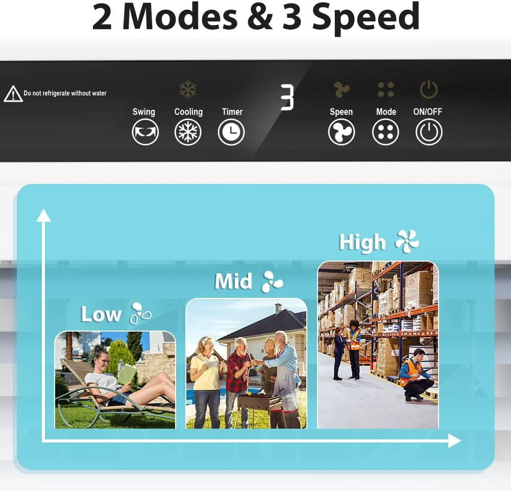 • [Powerful Cooling Effect]- Do not let ordinary tower fans limit your imagination with this evaporative cooler fan! The 3500 CFM swamp cooler can handle spaces up to 400 sq. ft. It's a 3-in-1 portable cooling fan that blows, humidifies, and cools the air. Use two ice boxes for help cool the water faster. This evaporative cooler is perfect for your room with less energy and comfortable humidity.