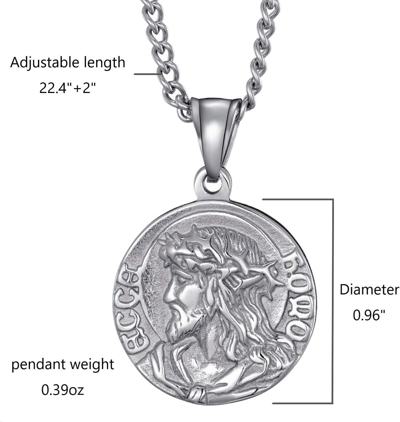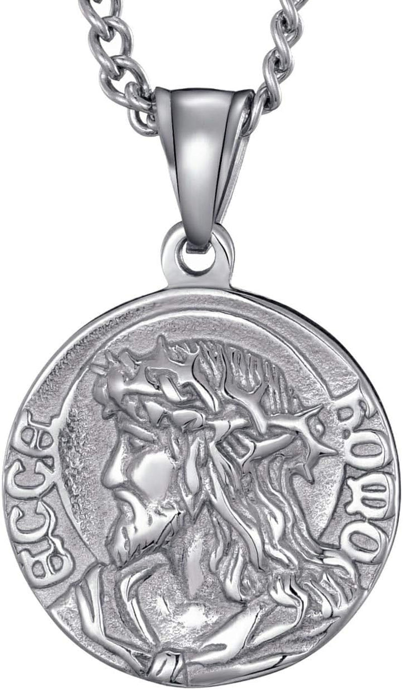Mens Stainless Steel Crown of Thorns Head of Jesus Christ Pendant Necklace round Medal Prayer Coin Pendant with Link Chain