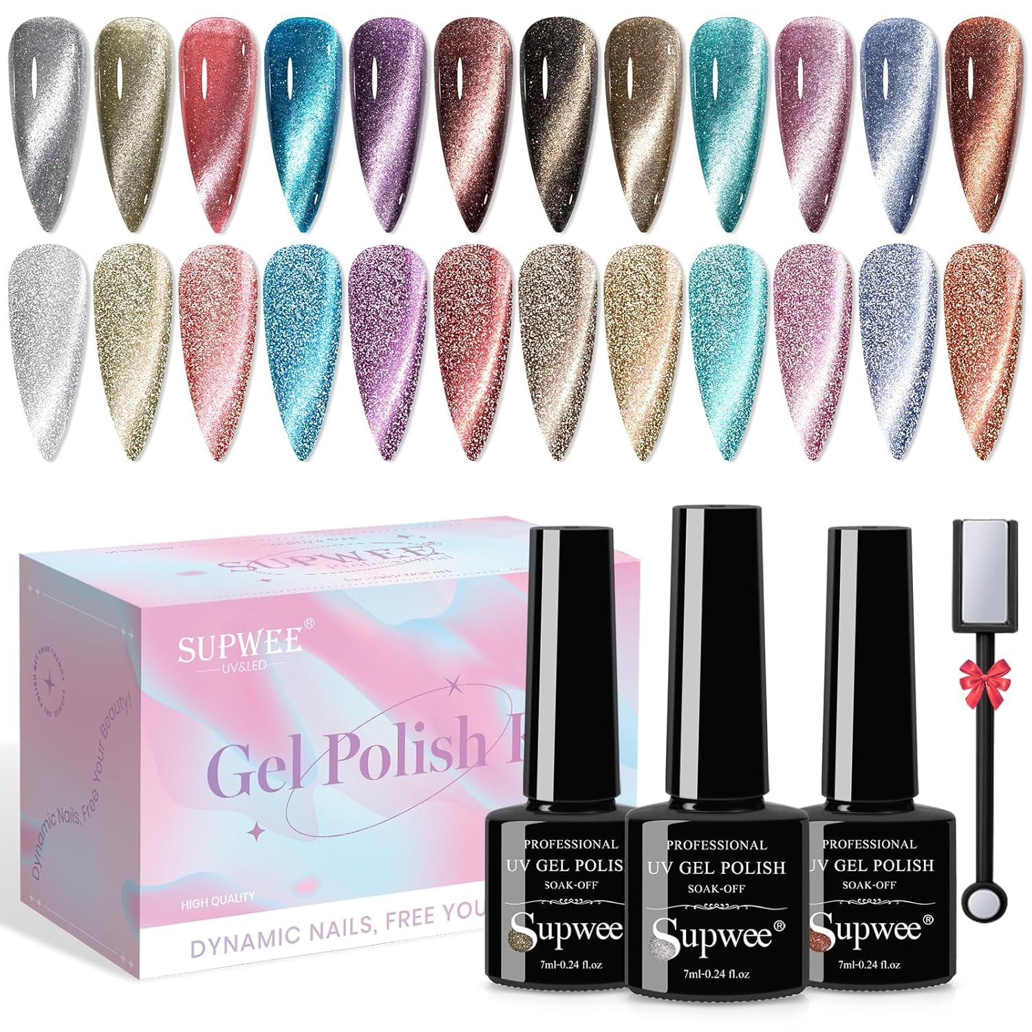 • Healthy and Long Lasting: SUPWEE Reflective Cat Eye Gel Polish is made of natural resin which non toxic, low smell, and has no harm to the skin, will be last for 21+days with proper operation