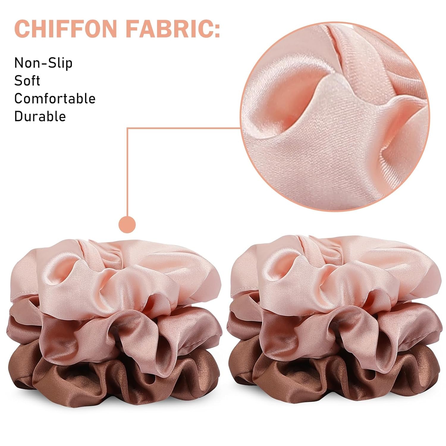 • Premium Quality Material: Our 6 pack hair scrunchies are made of premium satin fabric. After softening treatment, will not pull hair, do not hurt hair, for women's life to bring comfortable experience.