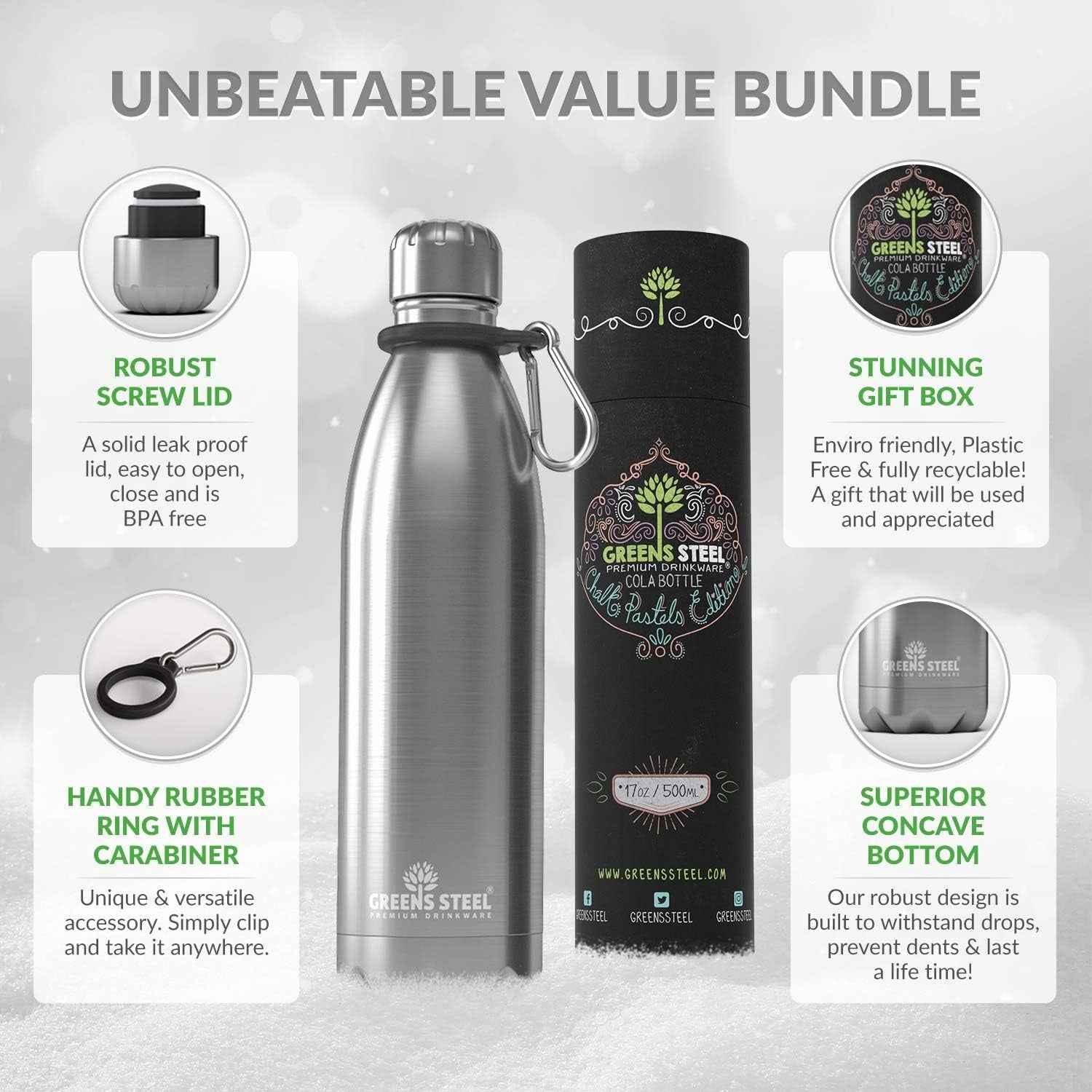• OTHER BOTTLES NOT KEEPING YOUR DRINK COLD? Greens Steel bottles are built to last you a lifetime. We use the latest double wall vacuum insulated technology to ensure maximum temperature retention! Say goodbye to lukewarm.