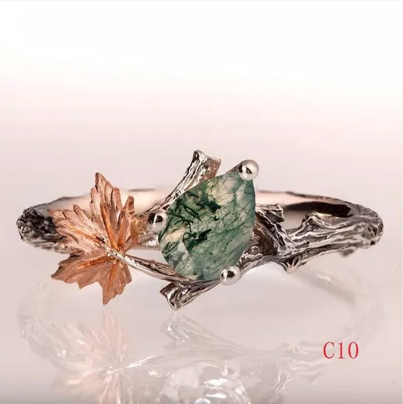 Vintage Maple Leaves & Flower Ring Set Antique Silver Women'S Fashion Twig Leaf Opal & Moonstone Ring Anniversary Gift Engagement Bridal Wedding Jewelry Rings Size 5-10