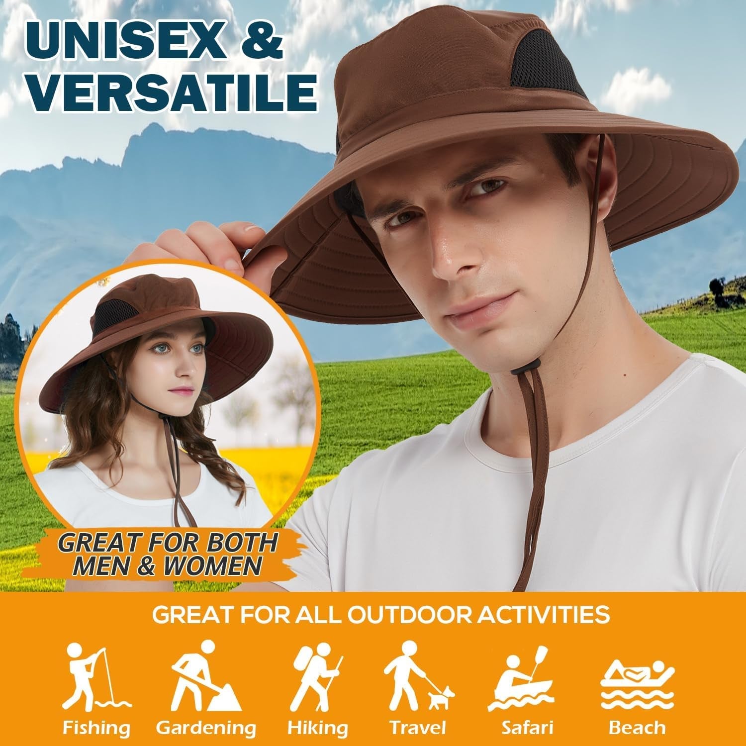 Wide Brim Sun Hat, UPF 50+ UV Protection Waterproof Packable Bucket Hat for Men & Women, Fishing Hiking Beach Garden