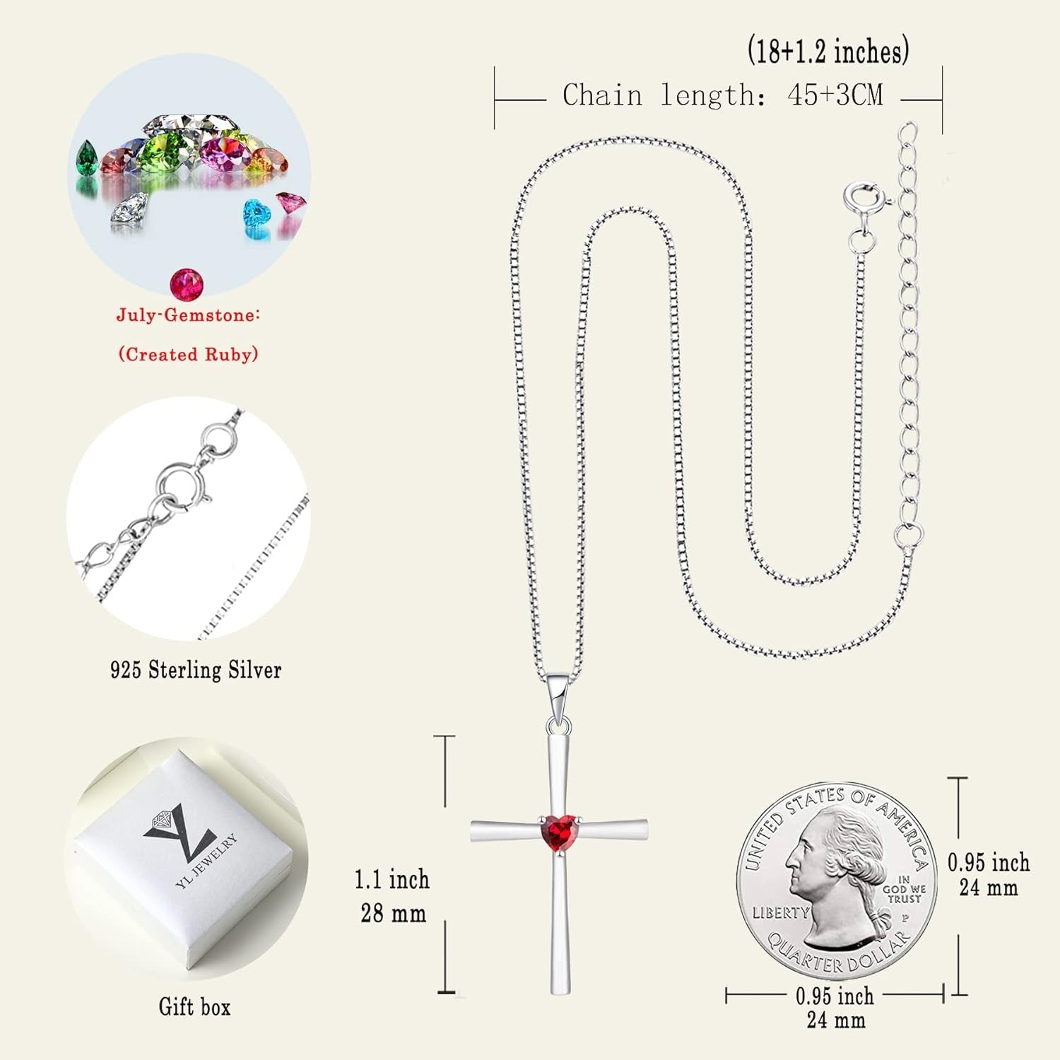 YL Women's Cross Necklace 925 Sterling Silver Crucifix Pendant Heart Cut Birthstone Criss Jewelry