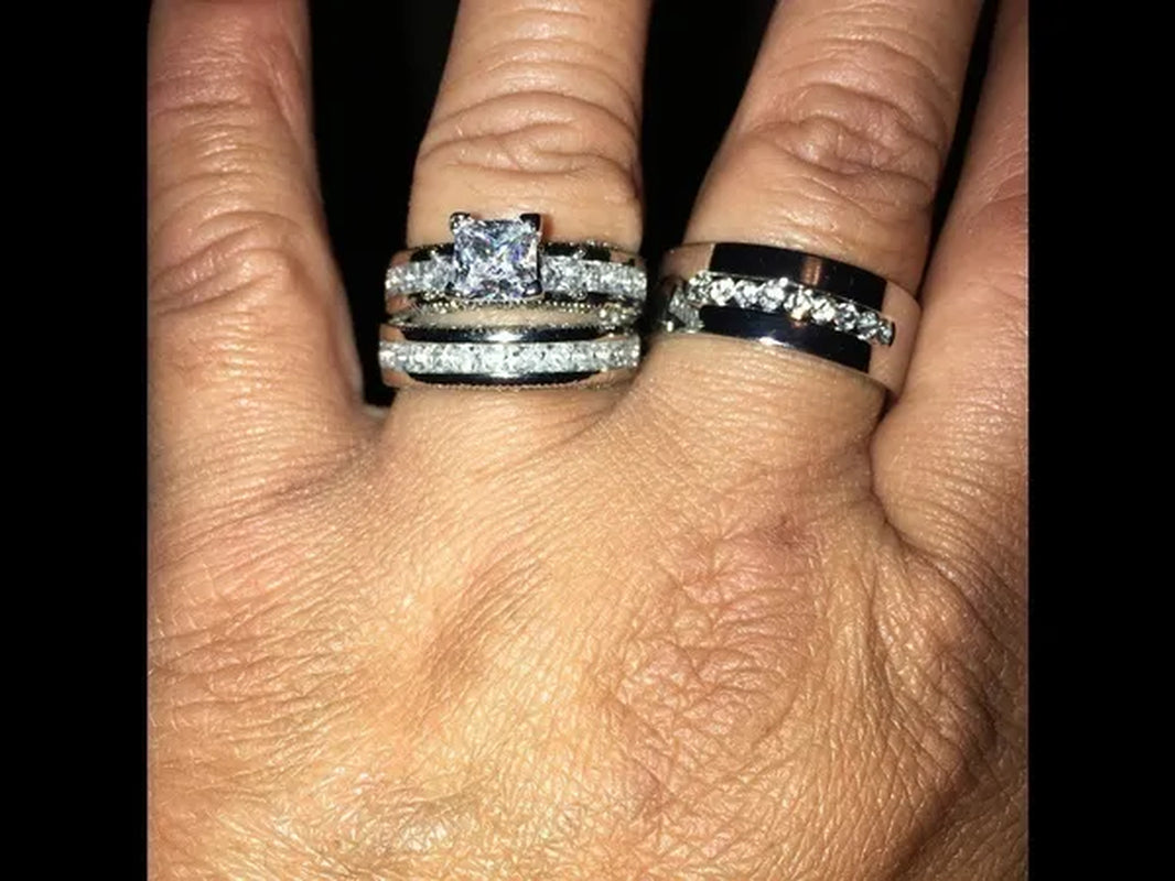 YOHAPP NEW Fashion Couple Rings Set Jewelry - Men's 8mm 316L Stainless Steel Titanium Ring and Women's Three Stone Princess Cut 1CT Diamond Silver Bridal Wedding Engagement Band Ring